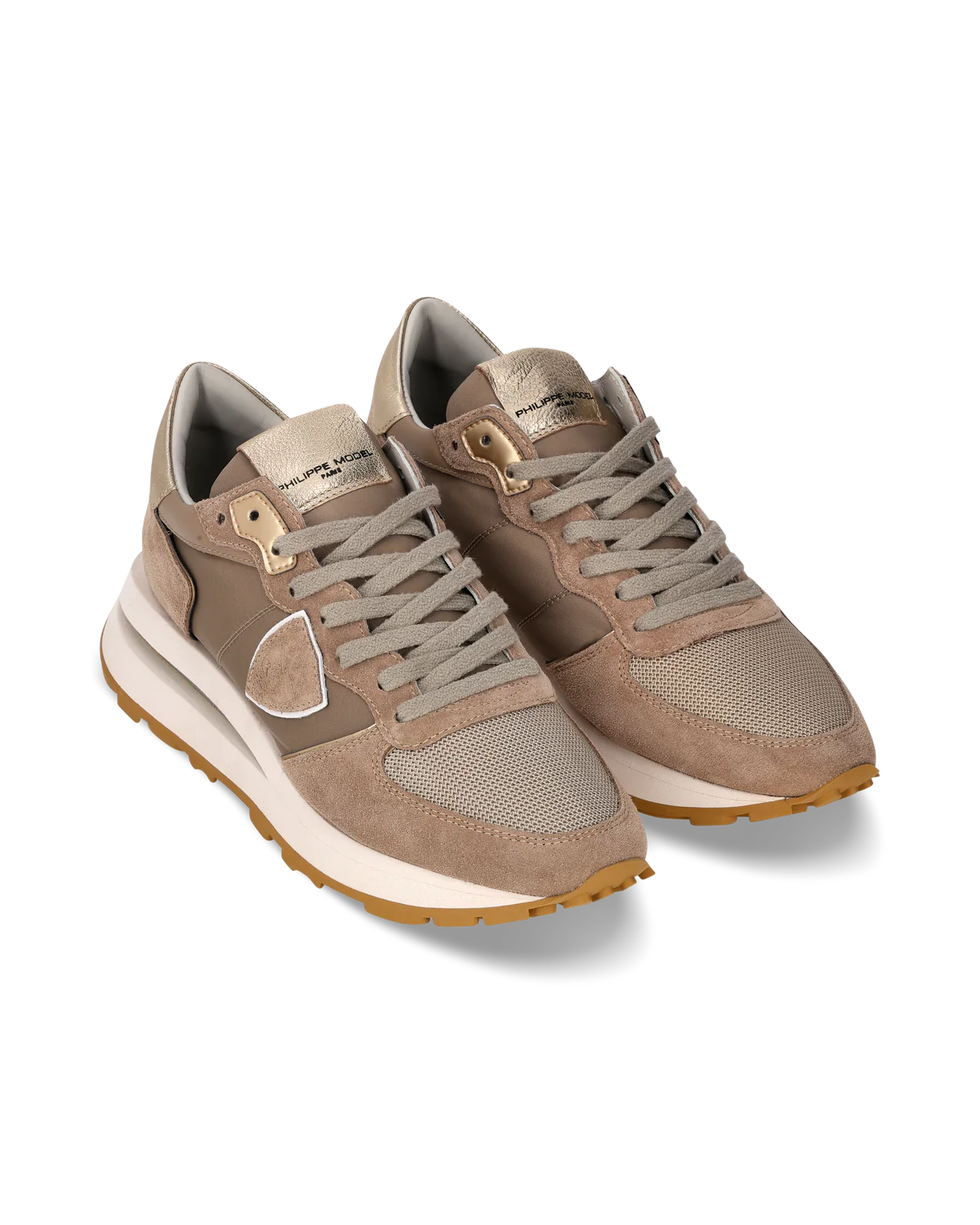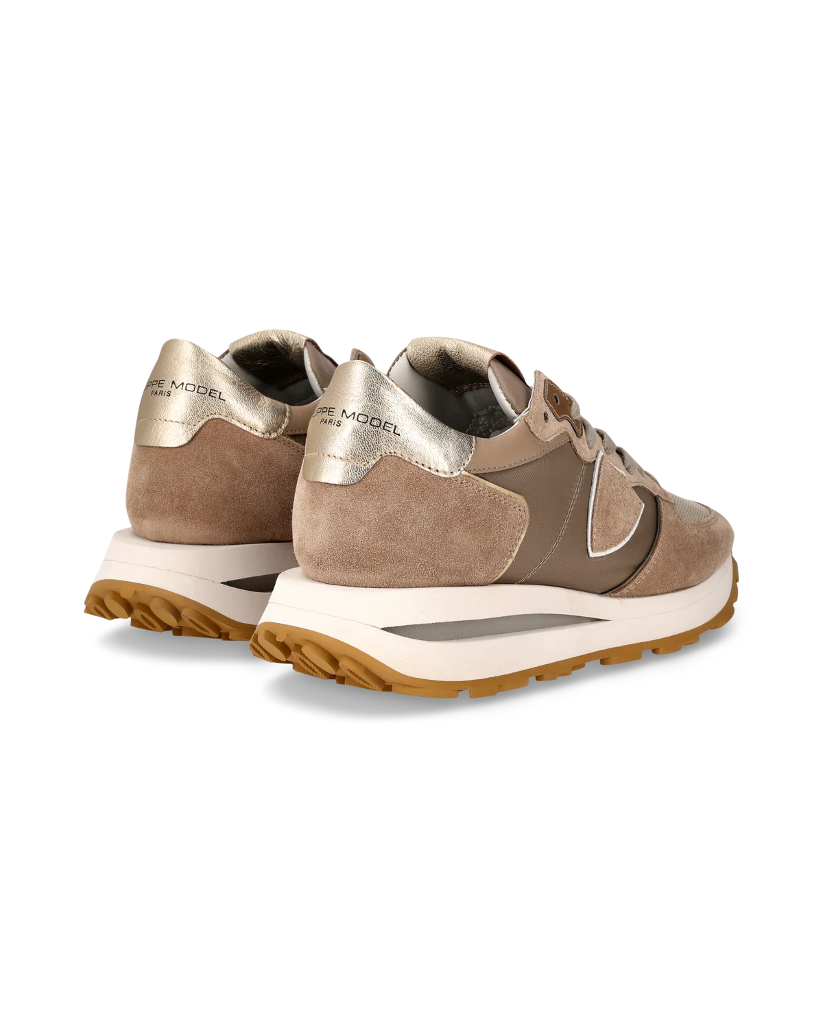 Cette nouvelle version de la Tropez Haute se distingue par son design coloré et métallisé. La tige beige au style sportwear est fabriquée dans un mélange de tissu technique mesh et suédine et ornée d’un liseré en cuir métallisé contrasté. Le modèle est doté d’une semelle en caoutchouc microporeux à double épaisseur et d’un empiècement contrasté sous le talon.