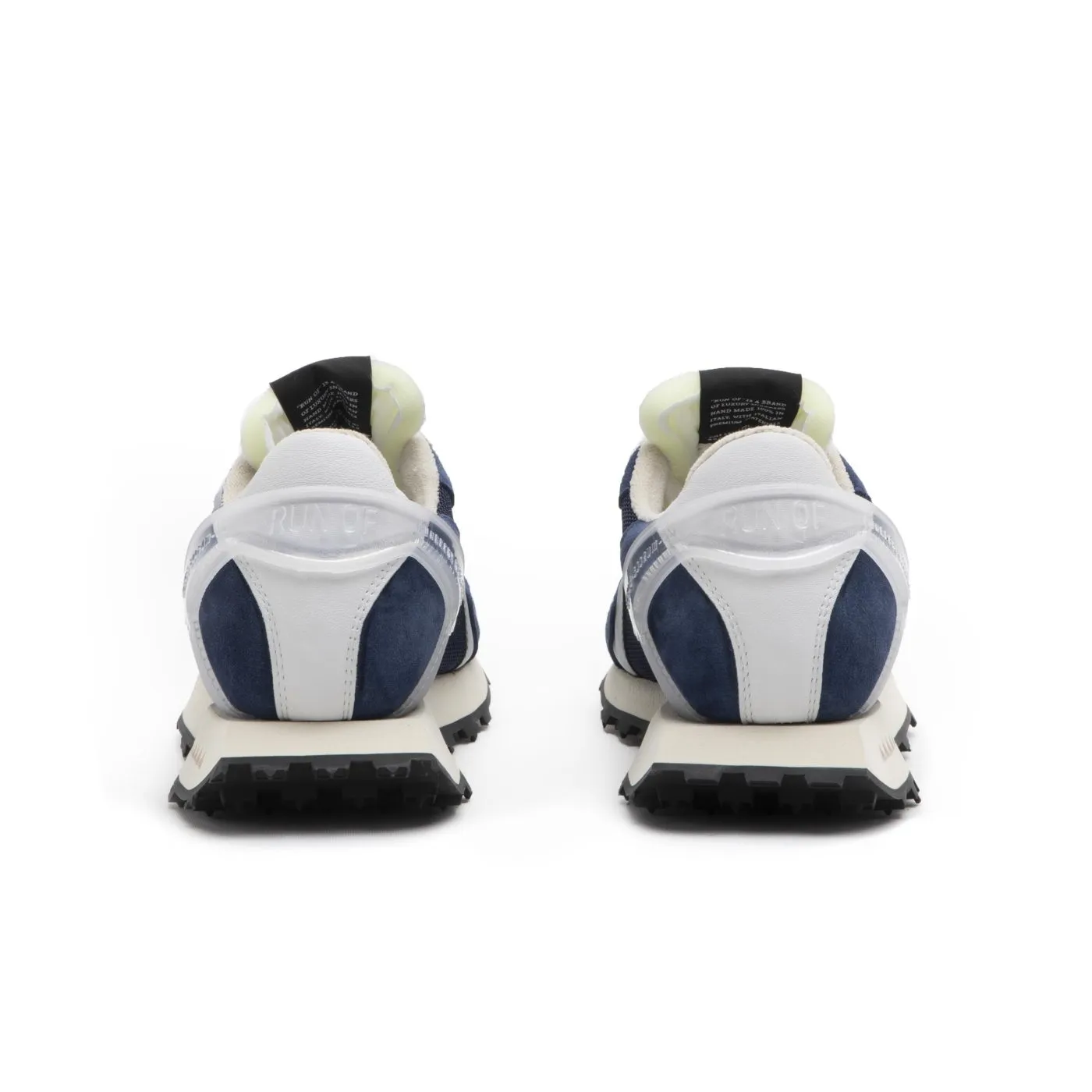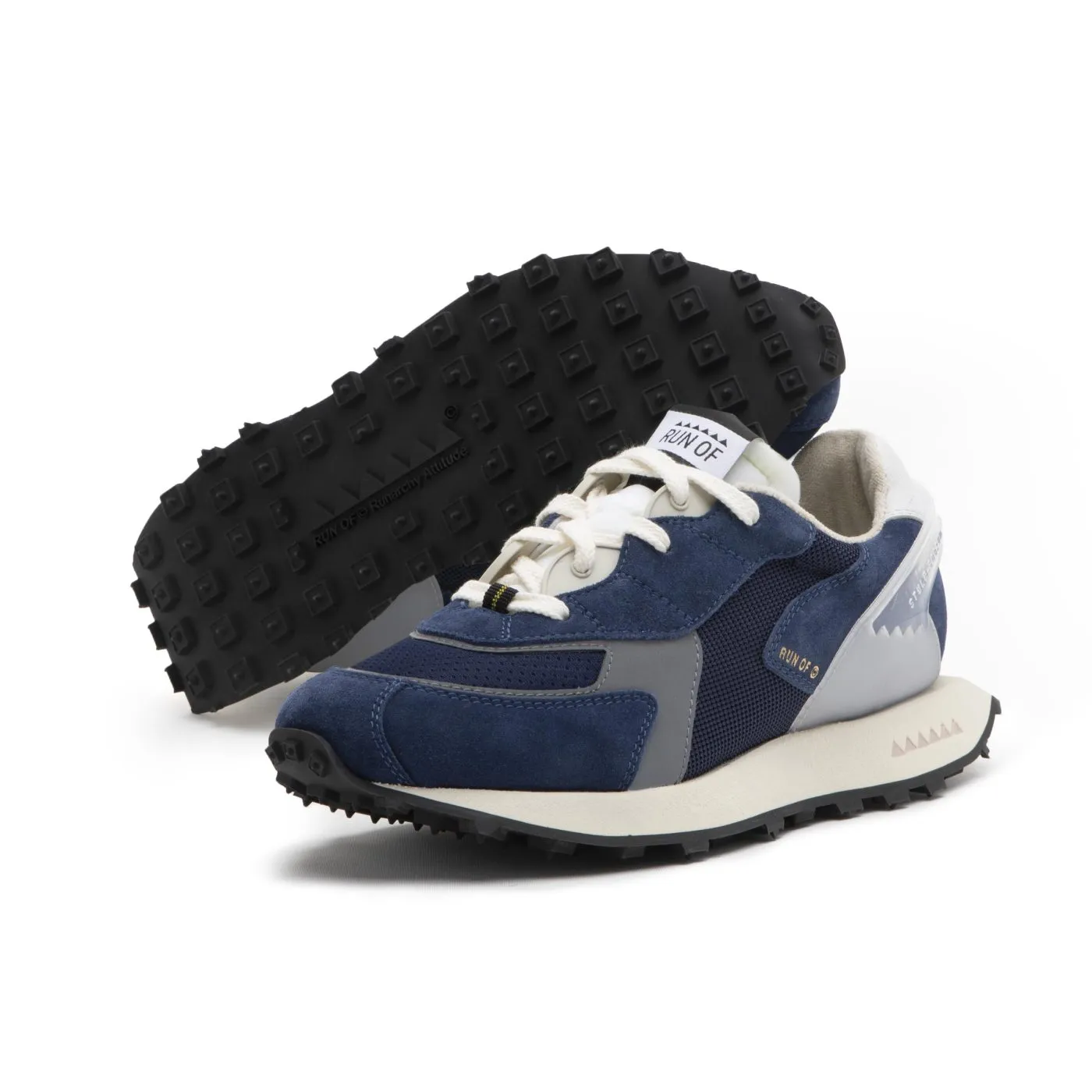 Baskets pour homme en daim bleu, nylon bleu, cuir réfléchissant gris et mesh bleu, avec talon en cuir blanc, doublure en coton et support en caoutchouc micro-injecté.