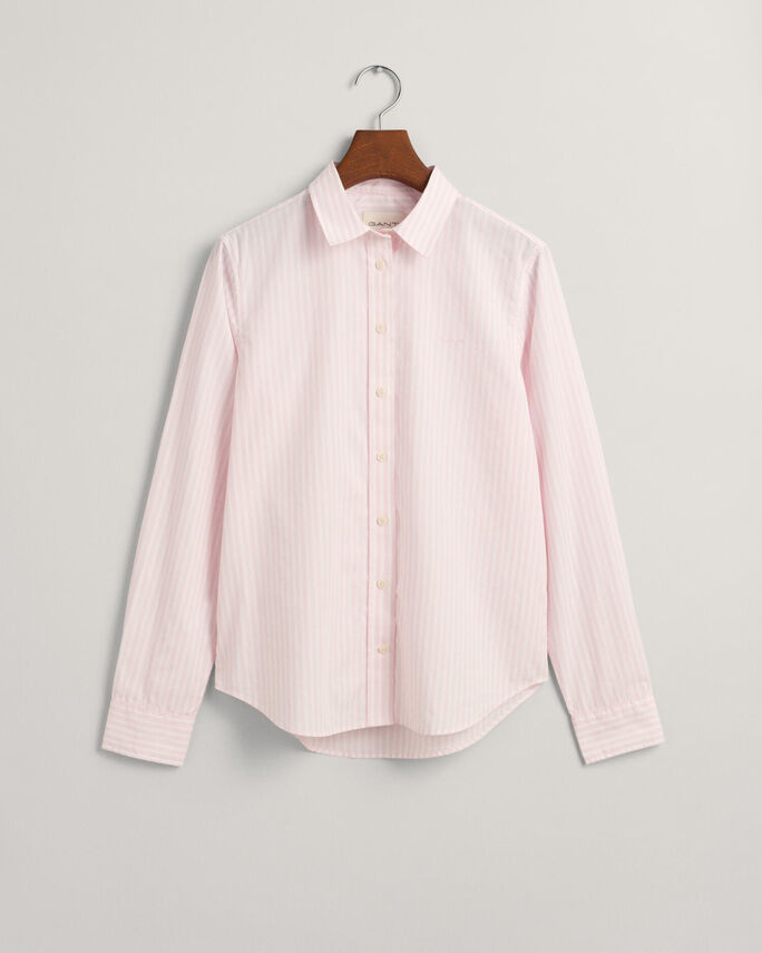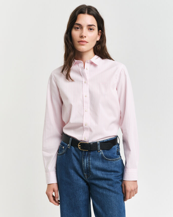 Arborant des rayures teintes en fil sur une popeline de coton épurée, cette chemise regular fit respire la décontraction. Elle présente des finitions telles qu’un col pointu, un ourlet incurvé et une broderie sur la poitrine, sans oublier notre pli creux caractéristique et notre patte d’accrochage dans le dos.