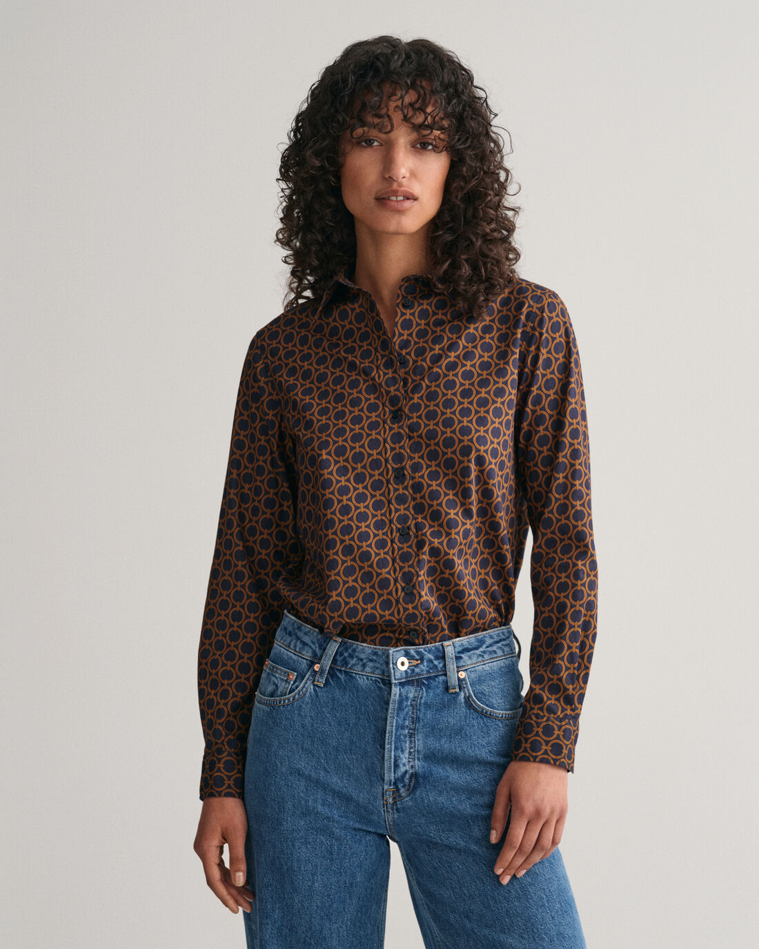Confectionnée en voile de coton mélangé fin et féminin, cette chemise apportera texture et fantaisie à vos tenues. Arborant un imprimé géométrique éclatant sur l’ensemble, elle présente une coupe regular, un col pointu et un ourlet incurvé, le tout complété par notre patte d’accrochage caractéristique et un pli creux dans le dos. Ce modèle polyvalent se porte avec un pantalon chino, une jupe ou un jean.