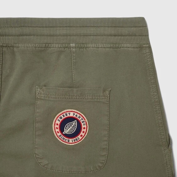 Pantalon en toile • coupe droite • double revers au bas de jambe • poche latérales avec rabats et pressions métalliques • ceinture en bord-côte et cordon de serrage en toile • patch logo sweet pants en feutrine tricolore à la poche arrière • 98% coton 2% elasthanne