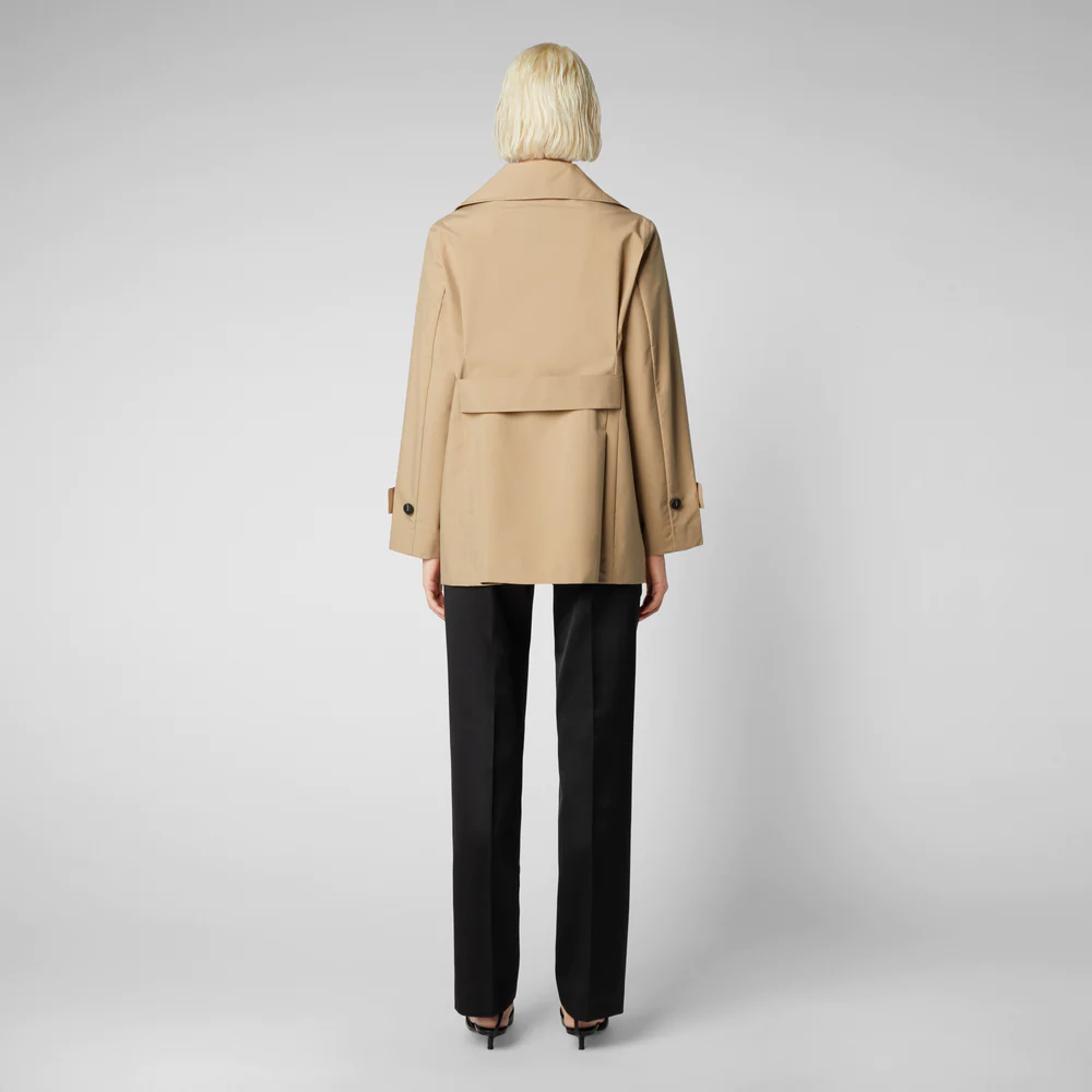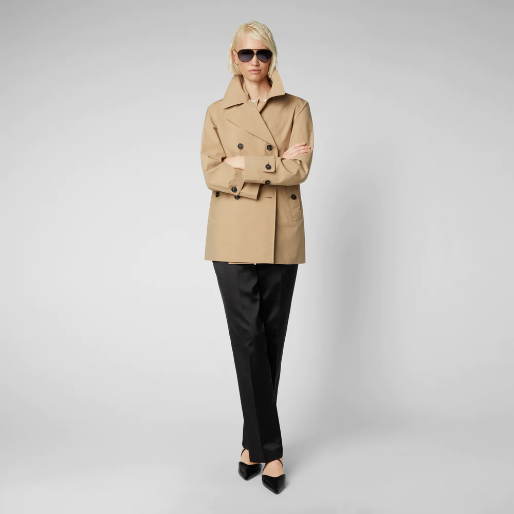Le trench court Sofi offre une nouvelle approche du style anglais classique, avec un large revers et une martingale au dos. Parfaite pour les averses estivales et les journées venteuses, elle est fabriquée dans un tissu technique avec des coutures partiellement étanches pour résister aux intempéries. Le double boutonnage à l’avant et les poignets réglables accentuent sa sophistication. Des boutons noirs caoutchoutés personnalisés et un logo thermocollé sur la manche gauche ajoutent une touche unique propre à Save The Duck.