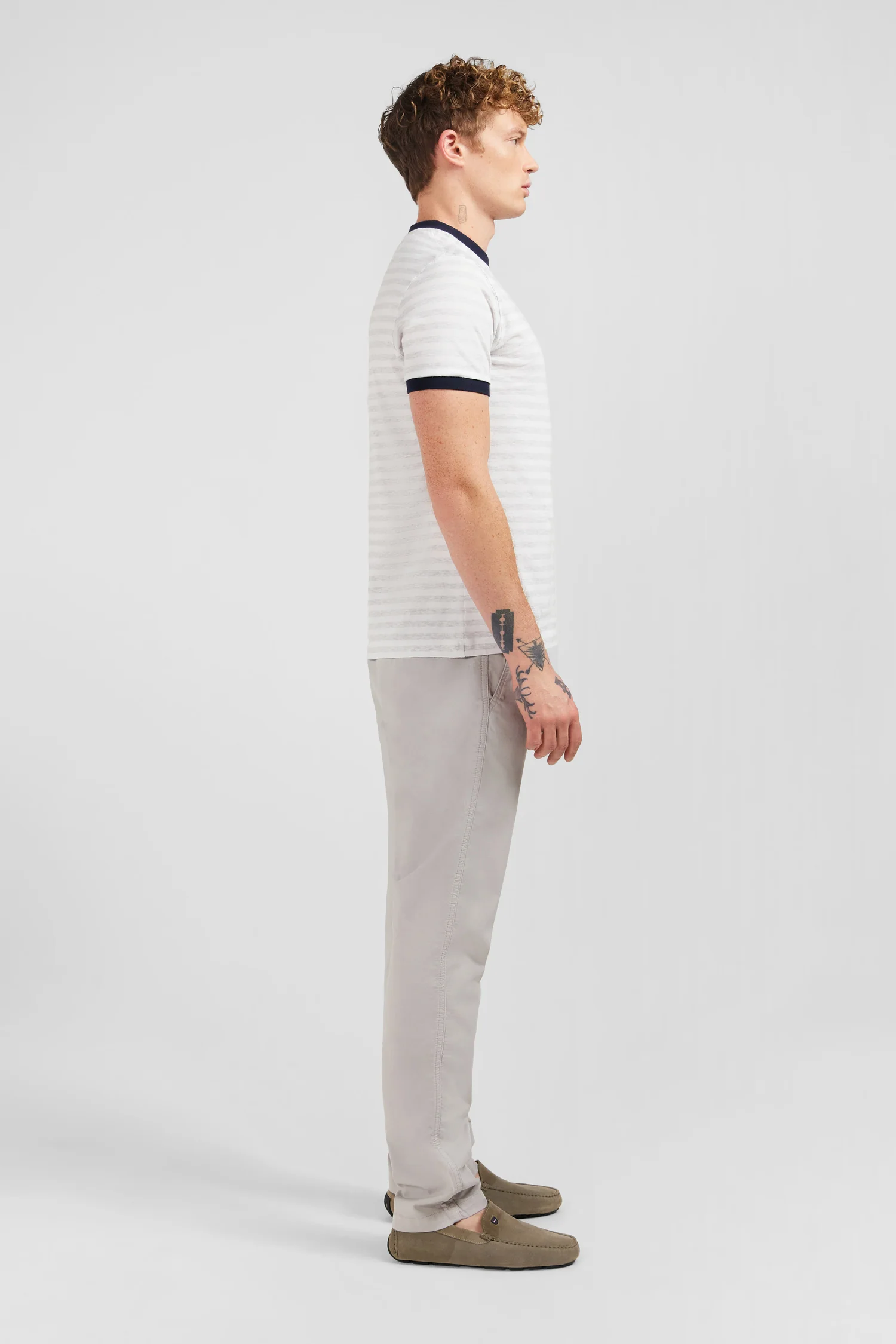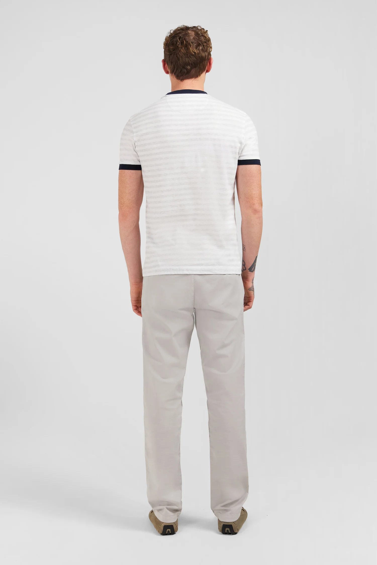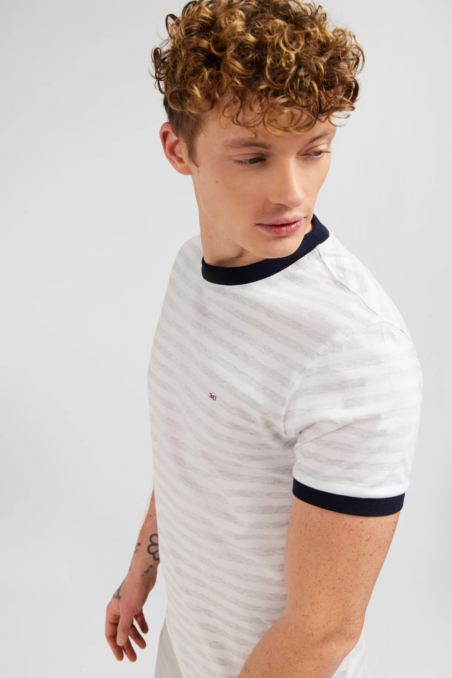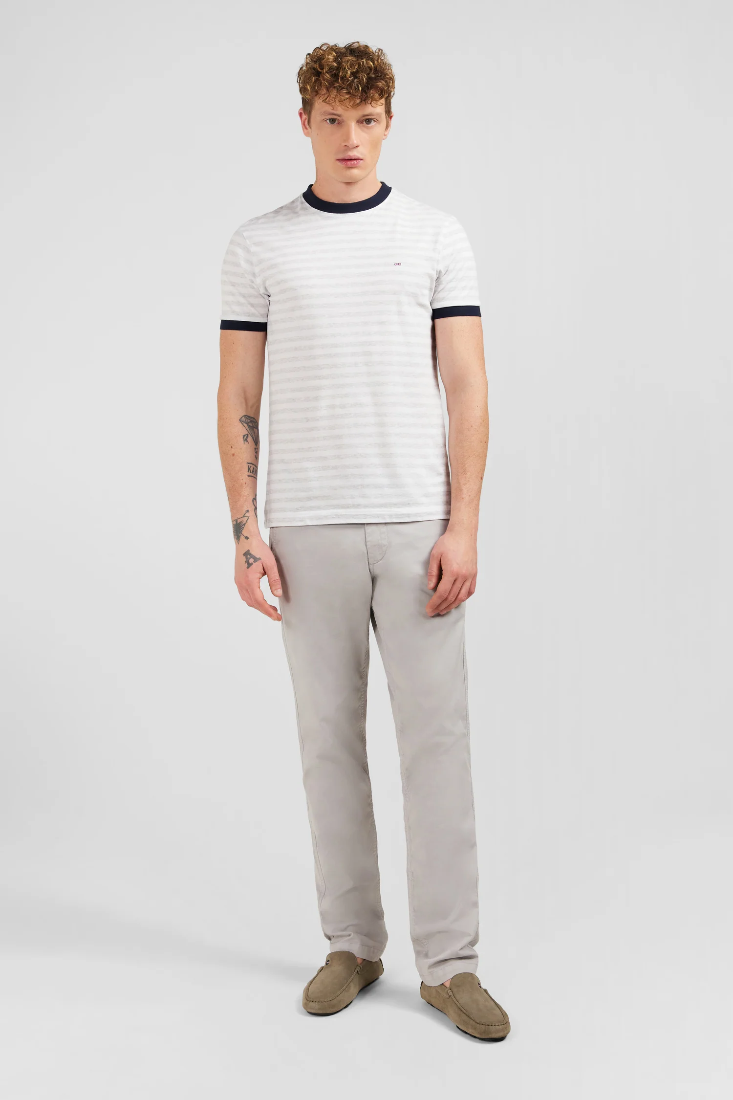 Ce t-shirt se distingue par ses rayures horizontales grises sur fond blanc, créant un effet visuel doux et raffiné. Les finitions noires au niveau du col rond et des manches ajoutent une touche de contraste élégante, faisant ressortir la sobriété et l’élégance de la pièce. Le logo emblématique Eden Park, délicatement brodé sur la poitrine, rappelle subtilement l’origine de la marque et sa réputation pour la qualité et le style.
