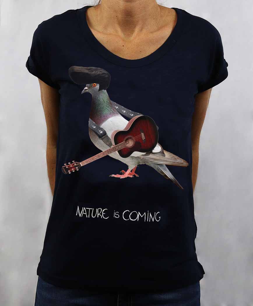 Tee shirt Navy manches courtes enroulées, col à bord brut, fentes latérales sur le bas, sérigraphie